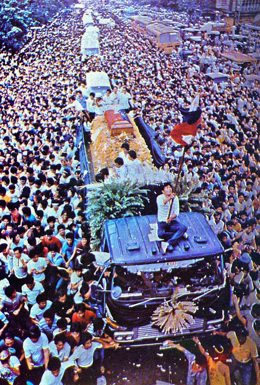 Ninoy’s funeral motorcade was very long and the people came out to give support. We left Santo Domingo Church around 9 or 10 AM and reached the funeral park in the evening. And I could feel the anger of the Ninoy supporters in the motorcade and the support of the people watching us pass. Most of the people who lined up along the streets were tentative. Some flashed the L or Laban sign; some did it very discreetly, still afraid to be seen. Only the street kids were noisy. But the adults watching the motorcade were, for the most part, just watching. Every time I leaned out of the car and shouted “Rebolusyon!”, I saw amazed and bewildered faces. But I could feel that the people were waking up. That was 1983.