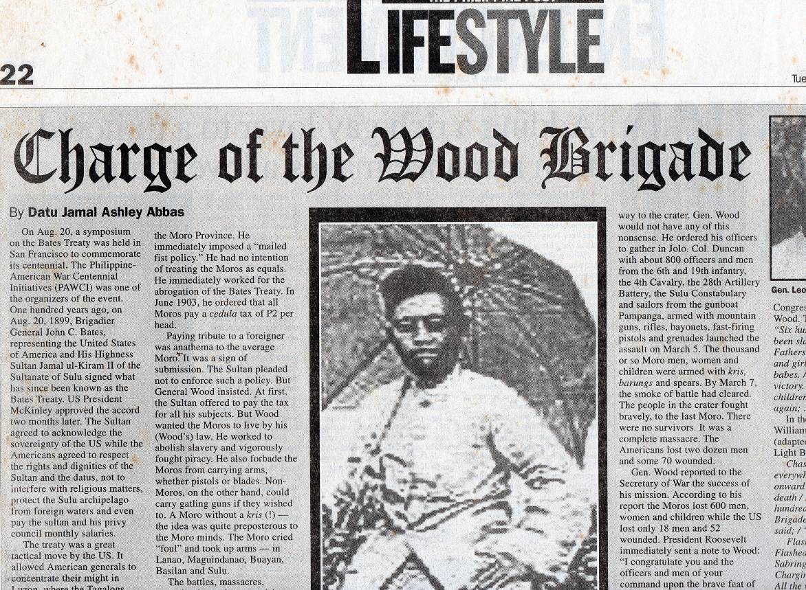 Last March 7 was the 105th anniversary of the Battle of Bud Dajo, the massacre of some 600 Moro men, women and children by the officers and men of the United States Armed Forces, with some (Christian) Filipino soldiers. In 1999, I wrote a newspaper article on this episode of Moro history to commemorate the centennial anniversary of the Bates Treaty. Below is the article published in The Philippine Post, a now defunct Philippine national daily newspaper, on Aug. 31, 1999.