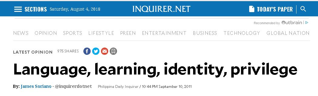 A certain James Soriano, an Ateneo de Manila University student and columnist of Manila Bulletin, wrote an essay titled “Language, learning, identity, privilege” for his