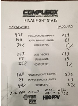 From the first round of the Pacquiao-Mayweather fight, I was shocked to hear the announcers claim that according to the Compubox, Mayweather threw and landed a lot more punches, including power punches. It was incredible! I didn’t see any power punch from Mayweather at all??!!