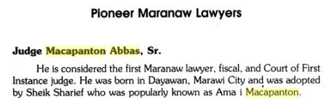 In his book, The Maranaws: Dwellers of the Lake, Dr. Madale gave a short write-up on my father. He wrote that Judge Macapanton Abbas, Sr. “was born in Dayawan, Marawi City and was adopted by Sheikh Sharief who was popularly known as Ama i Macapanton.”