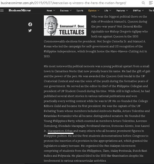Dooc, E. (2019, Sept. 27). Wenceslao Q. Vinzons: The Hero the Nation Forgot. The Business Mirror (https://businessmirror.com.ph/2019/09/27/wenceslao-q-vinzons-the-hero-the-nation-forgot/