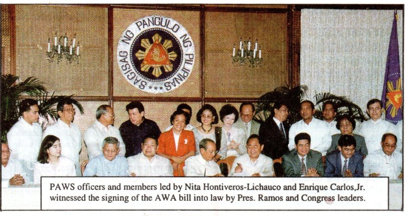 Republic Act 8485 or the Animal Welfare Act was the culmination of Nita Hontiveros-Lichauco’s long years of active campaigning and lobbying for the protection of animals in the Philippines. Ms. Hontiveros-Lichauco is the President and guiding light of the Philippine Animal Welfare Society (PAWS). President Fidel V. Ramos signed that law on February 11, 1998