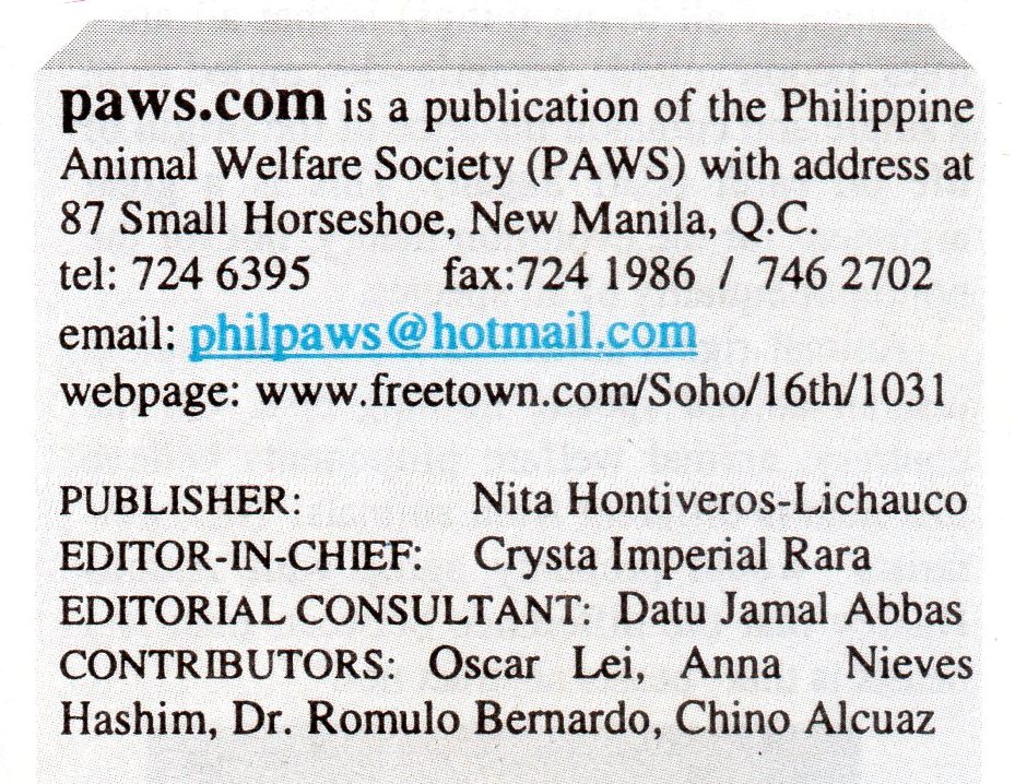 I joined PAWS a few months later. In July 1998, we published the very first issue of the PAWS newsletter paws.com where I was the Editorial Consultant. For that issue, I wrote the article “Animal Rights or Animal Welfare?” since I thought that Filipinos should be aware of the difference between the two. In the US, it seemed that the two camps were at each other’s throats.