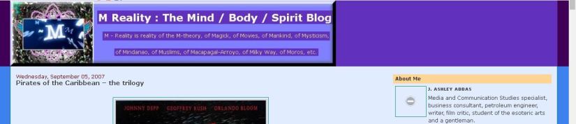 One of the post I recovered was my review of the Pirates of the Caribbean trilogy, which was published in Mr & Ms. magazine. For the past months, cable TV has been showing the Pirates of the Caribbean series, which went beyond Part 3. So, I am giving my 2007 post a new life in the Blogosphere. People who watched / are watching / will watch this trilogy might want to read this review…