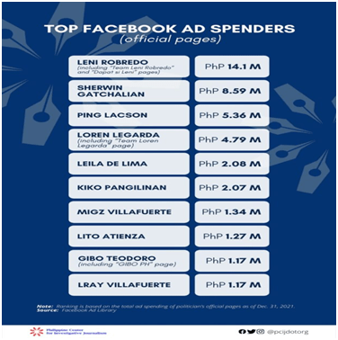 According to several reports, for the period August 4, 2020, the day when the FB transparency tool was activated, until December 31, 2021, VP Leni Robredo leads the candidates in FB ad spending with 14. 1 Million pesos followed by Sen. Gatchalian with 8.59 Million and Sen. Lacson with 5.36 Million pesos.