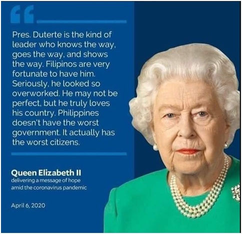 During the whole regime of President Duterte, the Duterte Die-Hard Supporters (DDS) has flooded Facebook with Fake News. Even memes that say Queen Elizabeth II admire Duterte are passed around and believed by his supporters.