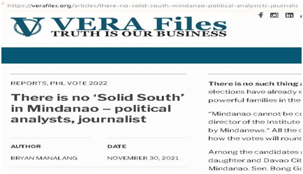 In an online forum hosted by MindaNews on Nov. 30, 2021, the panel of experts declared that there is no such thing as a Solid South or there is no such thing as a Mindanao Vote, esp. in the coming elections.