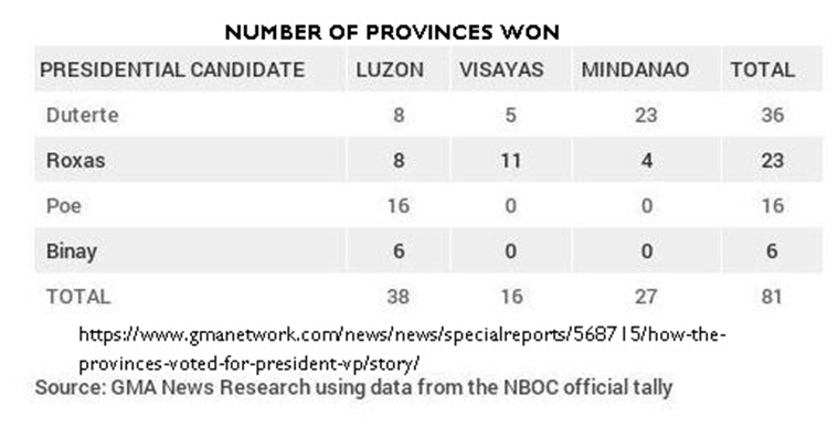 Duterte however, was not able to carry his VP running mate , Cayetano. Cayetano won only in 6 provinces – Duterte’s 5 provinces of Davao and Surigao del Sur.