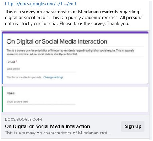 To get a better feel of the sentiments of the people of Mindanao, esp. of the Bangsa Moro, I put an Google doc ad in Facebook. It’s a survey form titled “On Digital or Social Media Interaction: a survey on characteristics of Mindanao residents regarding digital or social media.”