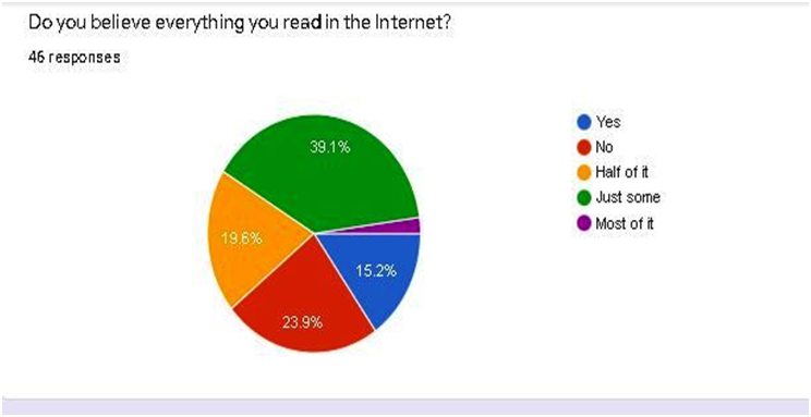 6. While they go often to the Internet, they do not necessarily believe what they read or see in the Internet. Around 39% say they believe some of it, while 24 % say they do not believe everything in it. 19.6% say believe half of it while some 15% believe most if not all that is put in the Internet.