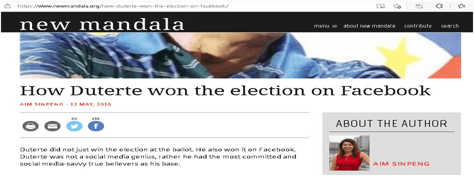 According to a Rappler article, the 2016 polls was branded a “social media elections” as social media played a vital role in it. A Manila Times article notes that “Social media was a game-changer in the 2016 elections according to the Asia Foundation.”