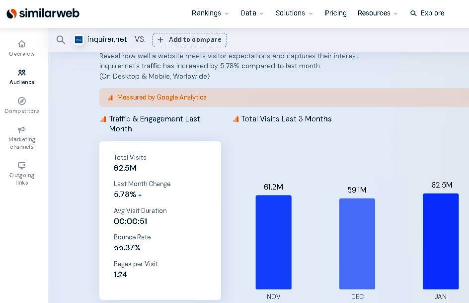 The criterion used by Alexa, Similarweb, Google and other ranking sites is the number of sites linking to it. The more sites linking to one’s site, the higher is its rank. Most ranking sites place inquirer.net it as the number one online news site in the Philippines. According to Similarweb, inquirer.net had 61.2M, 59.1 M, and 62.5 Million visits for the months of November 2021, Dec 2021, and January 2022 respectively. This data belies the Pulse Asia survey that said only 10% or 3% of Filipino internet users visit online news sites.