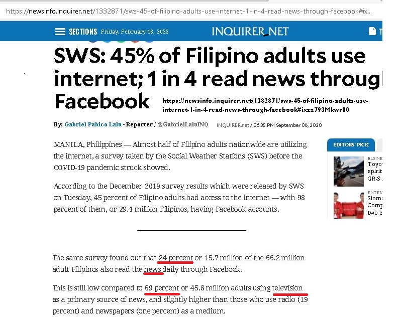 But in a Pulse Asia survey done in Sept. 2021, it reported that 48% of Filipinos get their political news from the Internet, 44% of them get the news from Facebook.