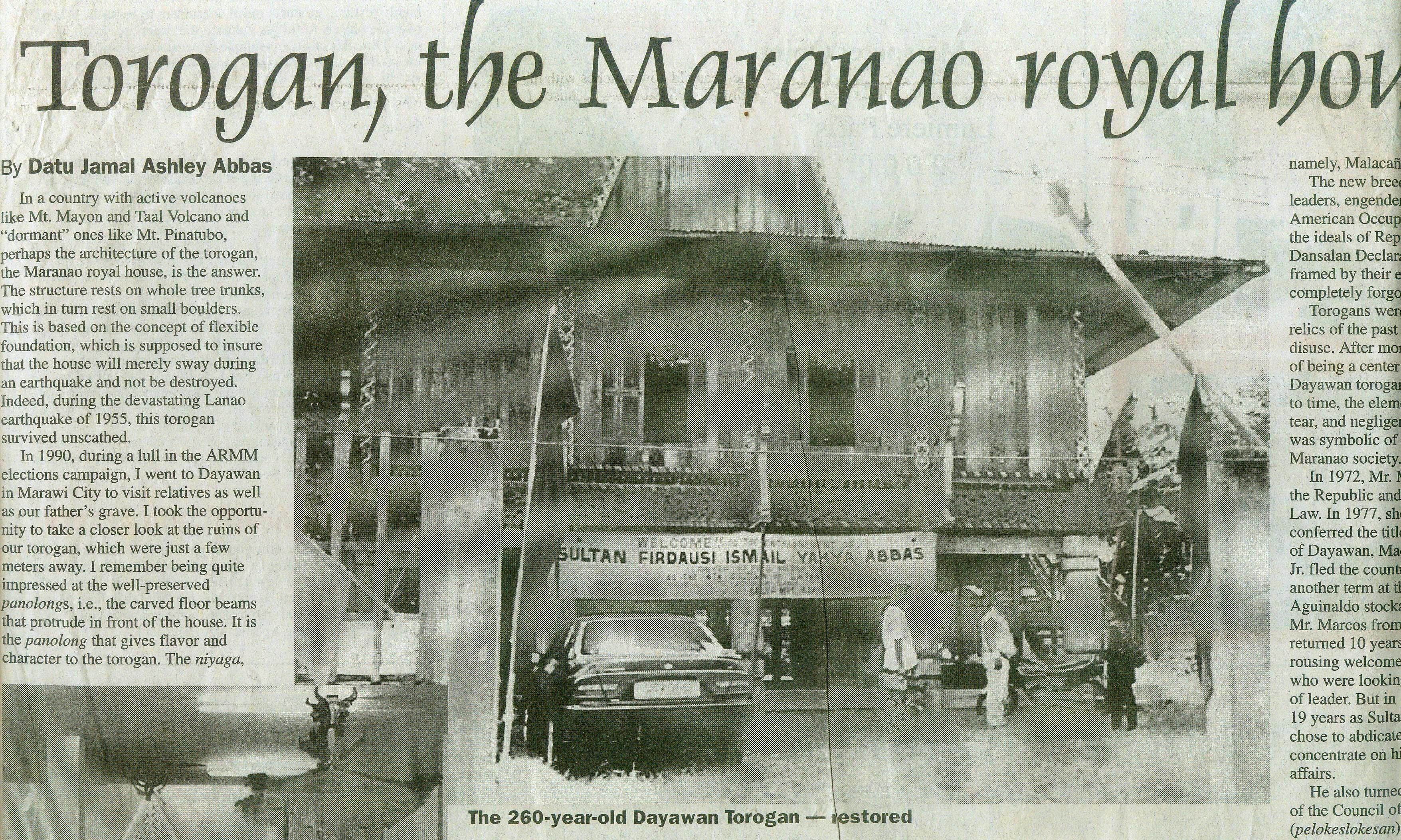 Upon Macapanton’s birth at the Dayawan torogan (royal house), his uncle Cotawato and his wife (Paramanis?) adopted him. According to my mother, Cotawato’s wife was the sister of Hadji Abbas. Adopting nephews and nieces was quite usual among Mranao families. Adopted children also acquire the rights and privileges to the ranks and titles of their adoptive parents. Thus, Macapanton and his descendants held the rights and privileges to two sets of royal bloodlines.