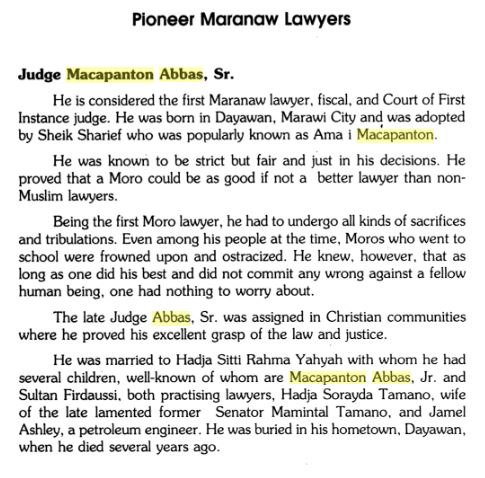 First off, my father was not just the first Maranaw lawyer, fiscal and CFI judge; he was the first Moro or Muslim Filipino lawyer, fiscal and CFI judge. I suppose he used Maranaw instead of Moro because the book is about Maranaws.