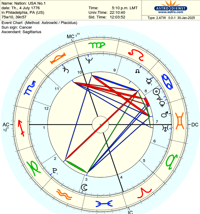 USA’s Chart: The USA’s natal chart (July 4, 1776) has a Sun in Cancer and a rising sign in Sagittarius, with Pluto in Capricorn. The transition of Pluto into Aquarius could signal a shift in the country’s focus from traditional structures (Capricorn) to innovation and collective ideals (Aquarius). This might manifest as a push for technological advancement, social reform, or a reimagining of democracy.