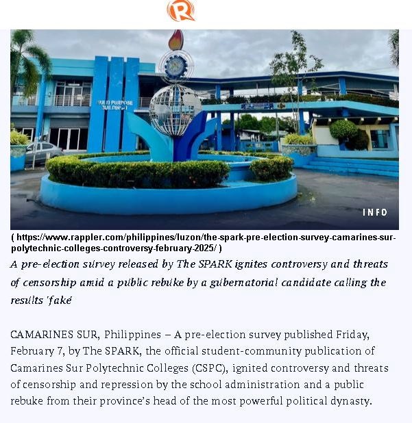 I urge the public to strongly condemn the blatant attacks on campus journalists at Camarines Sur Polytechnic Colleges (CSPC), particularly the undue pressure, intimidation, and threats faced by the editorial staff of The SPARK following the release of their pre-election survey. We need to stand in unwavering solidarity with these young journalists, who have demonstrated courage in upholding the principles of press freedom and responsible journalism.